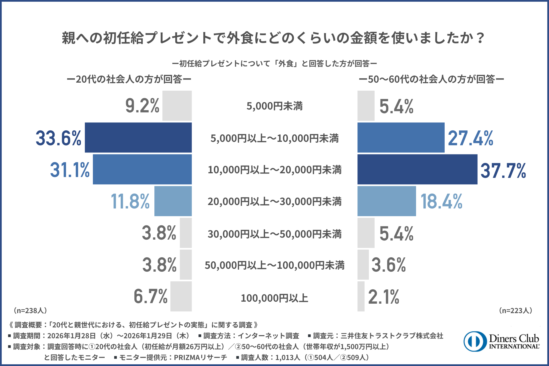 ダイナースクラブカードを発行する三井住友トラストクラブ株式会社(代表取締役社長:五十嵐幸司、以下当社)は、20代とその親世代を対象(調査概要参照)に「初任給プレゼントの実態」に関する調査を実施しました。
