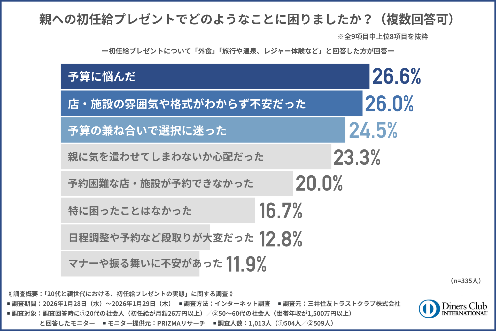 「親への初任給プレゼントでどのようなことに困ったか」について20代の社会人に尋ねたところ、最も多かった『予算に悩んだ(26.6%)』と僅差で『店・施設の雰囲気や格式がわからず不安だった(26.0%)』が続きました。「失敗したくない」というプレッシャーと、「どう選べば正解か分からない」という経験不足の中で、店選びに苦戦していたことがうかがえます。