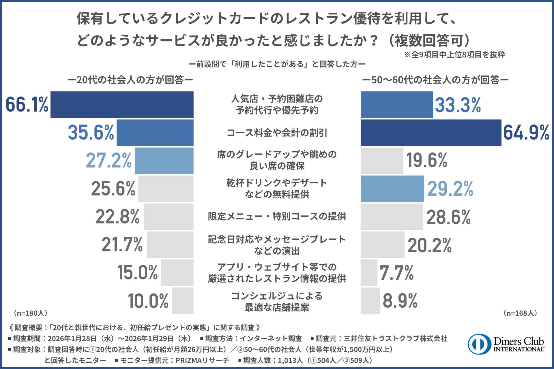 親世代が実利的な『コース料金や会計の割引』を最も評価しているのに対し、20代では『人気店・予約困難店の予約代行や優先予約』が約7割と、圧倒的な支持を集めました。店選びや予約に不慣れな若者にとって、クレジットカードは単なる決済手段ではなく、自力では確保が難しい憧れの店への「アクセス手段」として機能しています。