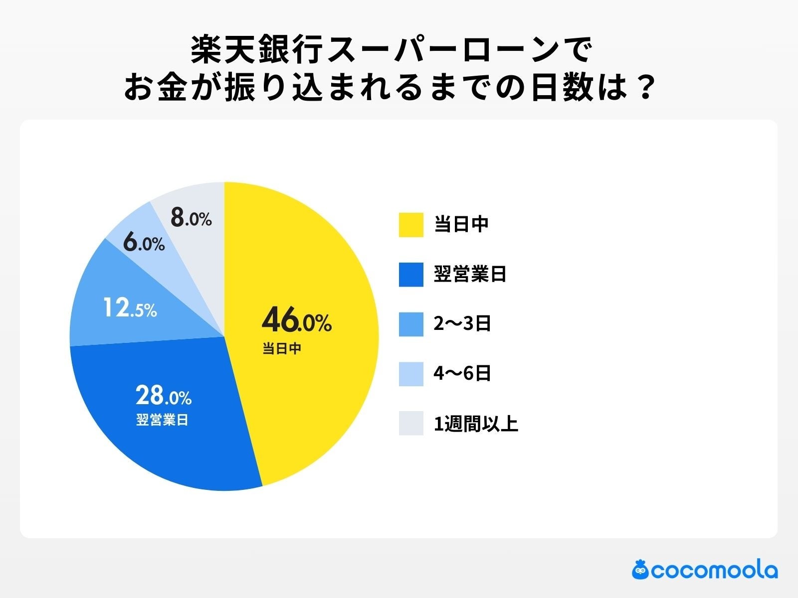• 融資スピードについては、銀行カードローンながら「当日中」に借入できた人が46%と最多で、スピード感への評価も高い。※審査状況による