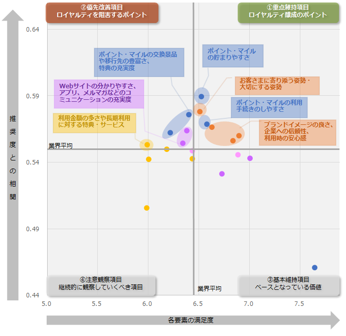 一方で、優先的に改善が求められる項目としては、「ポイント・マイルの交換景品や移行先の豊富さ」や「店舗での商品やサービス(駐車場など)の割引、追加ポイント・マイル付与などの特典の充実度」といったポイントやマイルの使い勝手のよさに関連する項目や、「利用金額の多さや長期利用に対する特典・サービス」となりました。また、「Webサイト(マイページは除く)の分かりやすさ・使いやすさ」、「会員専用ページや公式アプリ、メルマガ、会報誌などのコミュニケーションの充実度」といった項目でも今後の改善が期待される結果となりました。