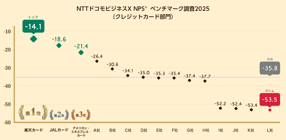 NTTドコモビジネスX株式会社(旧:NTTコムオンライン、本社:東京都品川区、代表取締役社長:稲葉 秀司、以下NTTドコモビジネスX)は、クレジットカードを対象にNPSベンチマーク調査2025を実施しました。この結果、最もNPSが高いのは楽天カードとなりました。