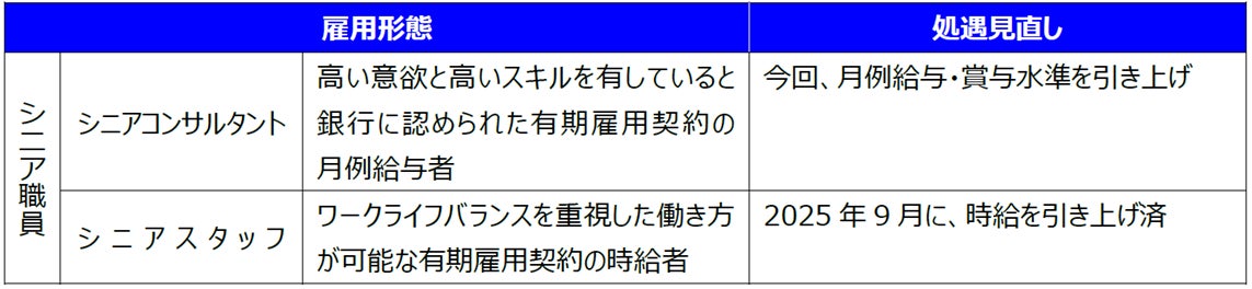 定年(60歳達齢)後に再雇用された職員の総称を「シニア職員」とし、以下の2つの雇用形態を設定。今回、シニアコンサルタントの処遇見直しを実施(シニアスタッフの時給は昨年見直し済)。