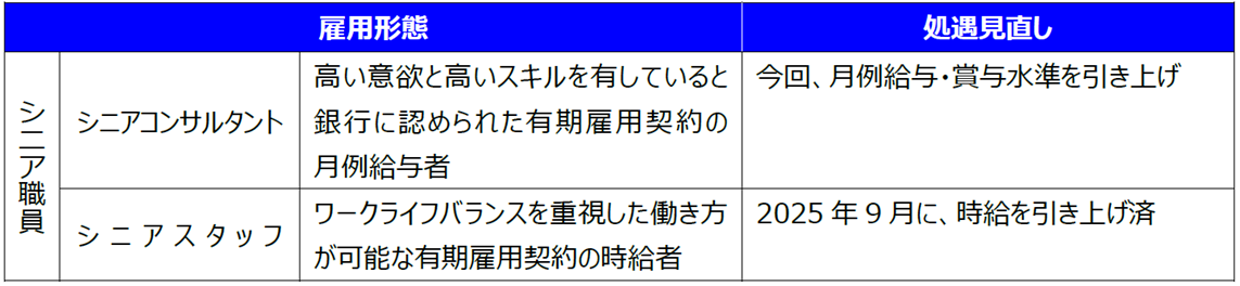 定年(60歳達齢)後に再雇用された職員の総称を「シニア職員」とし、以下の2つの雇用形態を設定。今回、シニアコンサルタントの処遇見直しを実施(シニアスタッフの時給は昨年見直し済)。