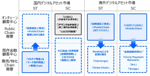 海外SCは、従来の「オンチェーン投資家」を対象とした暗号資産関連取引で利用されるSCのみならず、欧州のMiCA*11や米国のGENIUS法*12を契機に、欧米の金融機関同士でコンソーシアムを組んで共同のSCを発行する検討*13 も始まっています。金融機関の利用要件を踏まえ、USDCをパブリックチェーンで展開してきたCircle社が「Circle Payment Network」*14を展開するほか、SC決済に特化したチェーンである「Arc」*15の開発も発表、決済プラットフォームのStripe社が越境決済の課題解決を目的とした独自チェーン「Tempo」*16を開発する等、SCについても専用チェーンの構築が加速しています。