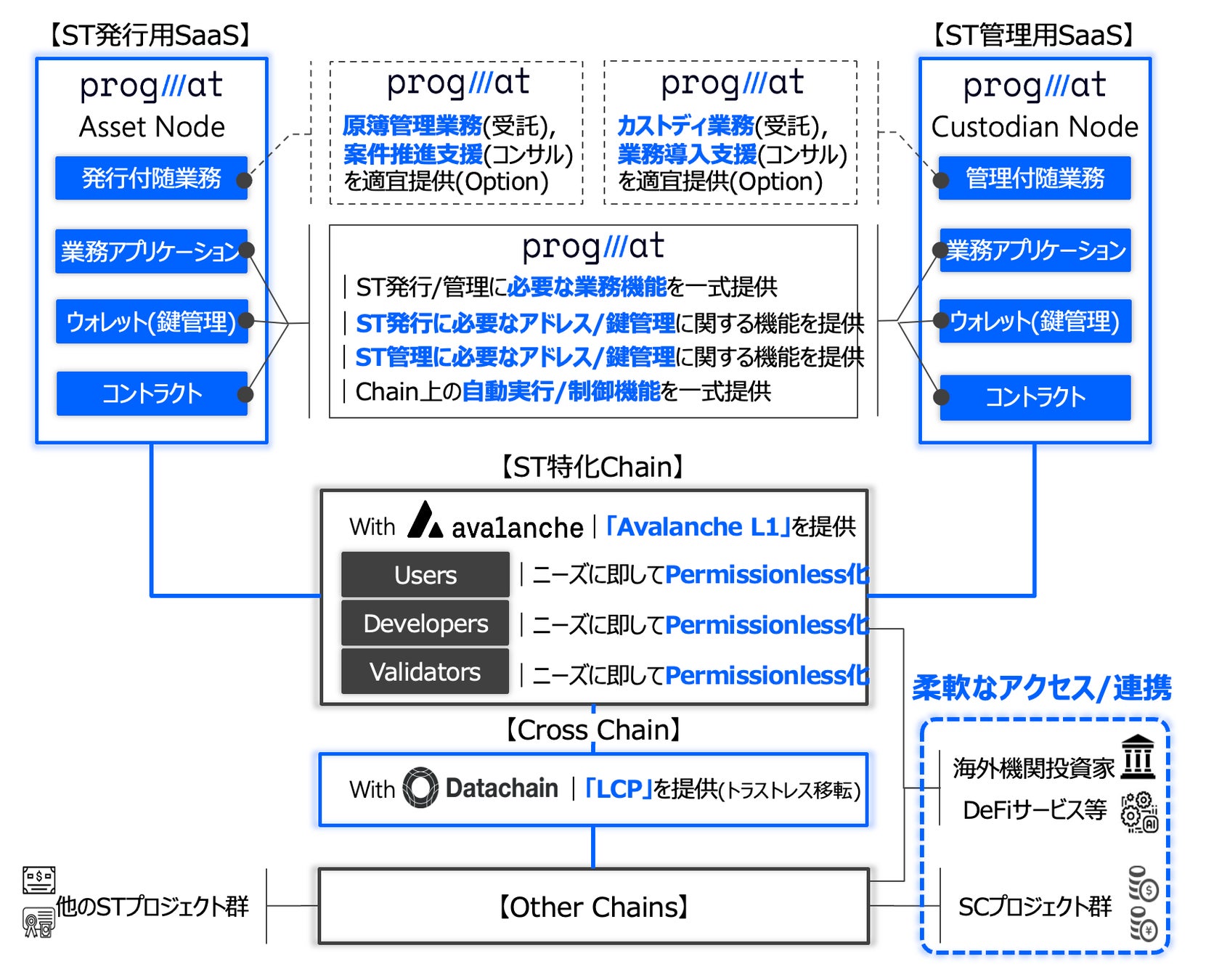 Progmat, Inc.(代表取締役: 齊藤 達哉、以下Progmat社)は、Avalancheおよび株式会社Datachain(代表取締役 CEO:久田 哲史、以下Datachain)と協業し、デジタル証券(Security Token、以下ST)やステーブルコイン(Stable Coin、以下SC)を核とした「金融システムのパブリックチェーン展開」を加速させるべく、デジタルアセット発行・管理基盤「Progmat」のマルチチェーン化とクロスチェーン対応を開始します。