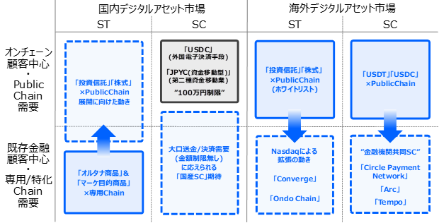 海外SCは、従来の「オンチェーン投資家」を対象とした暗号資産関連取引で利用されるSCのみならず、欧州のMiCA*11や米国のGENIUS法*12を契機に、欧米の金融機関同士でコンソーシアムを組んで共同のSCを発行する検討*13 も始まっています。金融機関の利用要件を踏まえ、USDCをパブリックチェーンで展開してきたCircle社が「Circle Payment Network」*14を展開するほか、SC決済に特化したチェーンである「Arc」*15の開発も発表、決済プラットフォームのStripe社が越境決済の課題解決を目的とした独自チェーン「Tempo」*16を開発する等、SCについても専用チェーンの構築が加速しています。