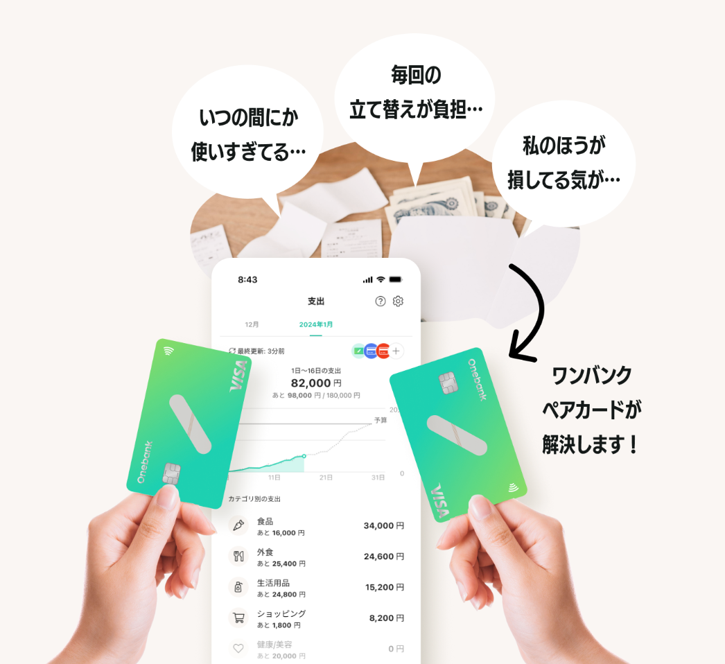 共働き世帯の増加や、事実婚・同性パートナーとの暮らしなどライフスタイルの多様化に伴い、生活費をふたりで共同管理したいというニーズが急増しています。2021年から提供している「ワンバンク ペアカード」なら、ふたりでチャージした共有残高からApple Payで直接決済が可能。どちらが支払っても即座に通知が届き、履歴が共有されるため、面倒な割り勘や送金の必要がありません。スマホ1つで「ふたりの家計」を可視化します。(ペアカードの詳細:https://onebank.jp/card/pair/ )