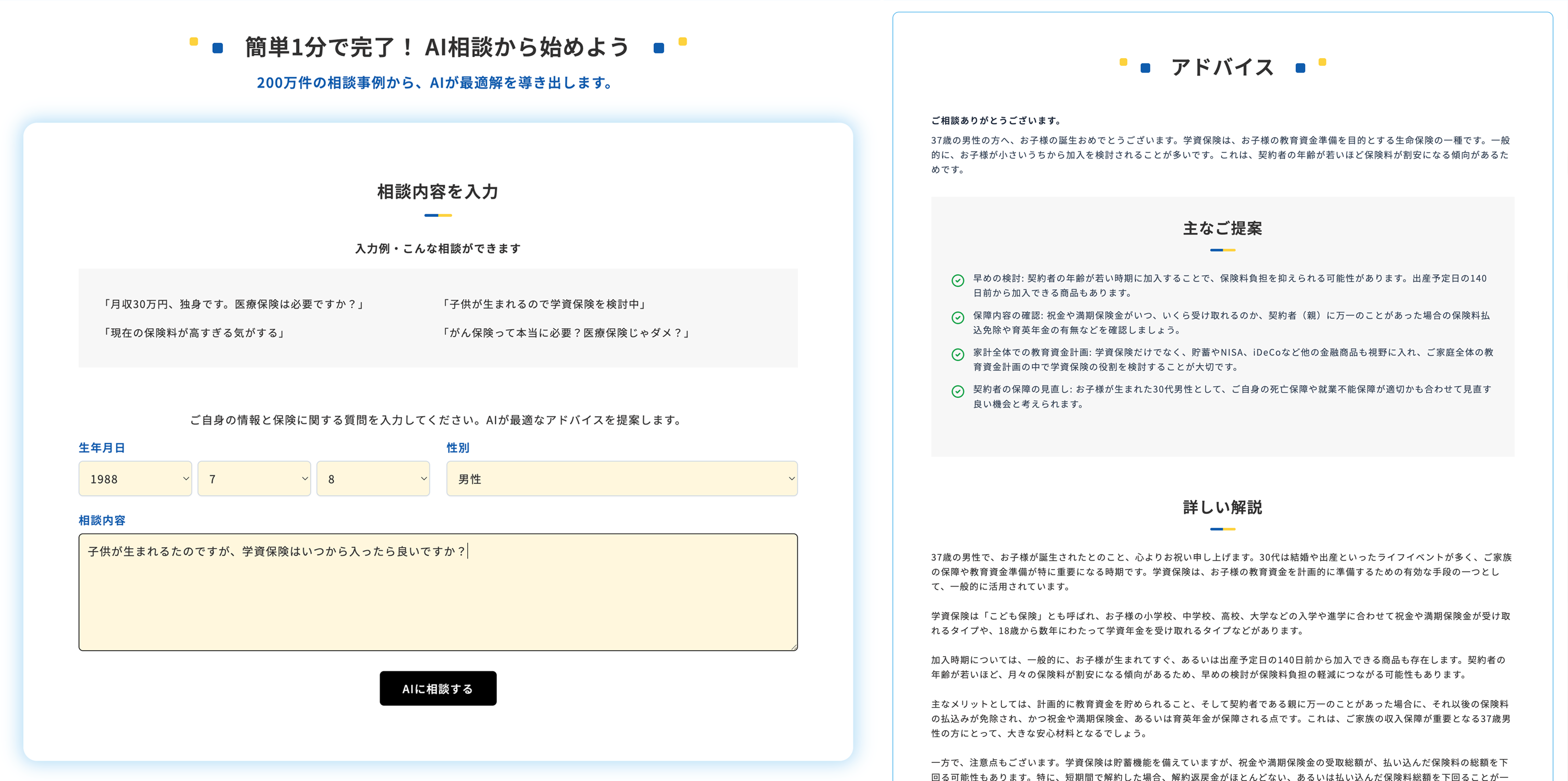 ①AI保険相談(24時間対応) AIが、生年月日、性別、相談内容から保険の悩みに回答します。「200万件の相談事例から、お客様にとって必要な保障」を提案します。