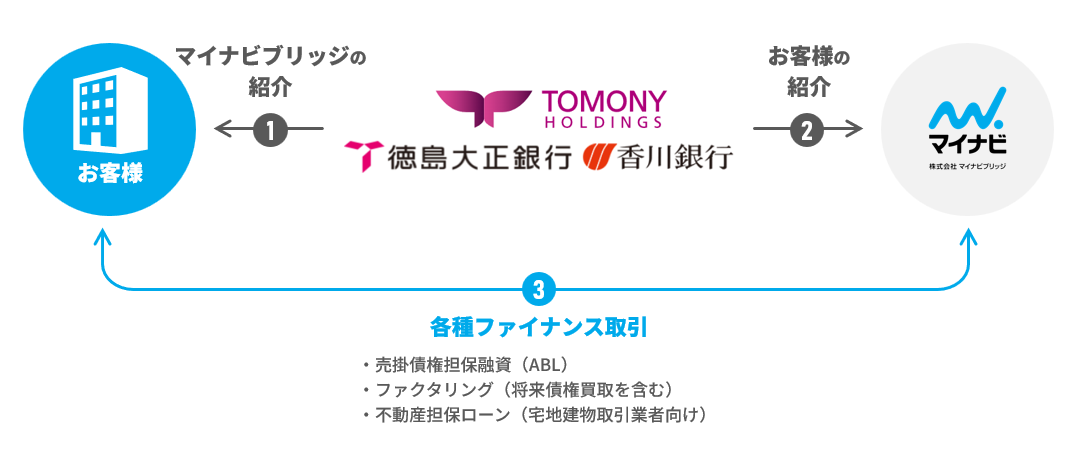 トモニ販路拡大サポート基本契約に基づき、徳島大正銀行・香川銀行の両行より、資金繰りの課題や突発的な大口支出への対応にお悩みのお客さまをご紹介いただき、マイナビブリッジが提供する各種ファイナンスサービスを通じて両行の金融サービスを補完することで、地域企業の成長支援および地域経済の活性化に取り組んでまいります。