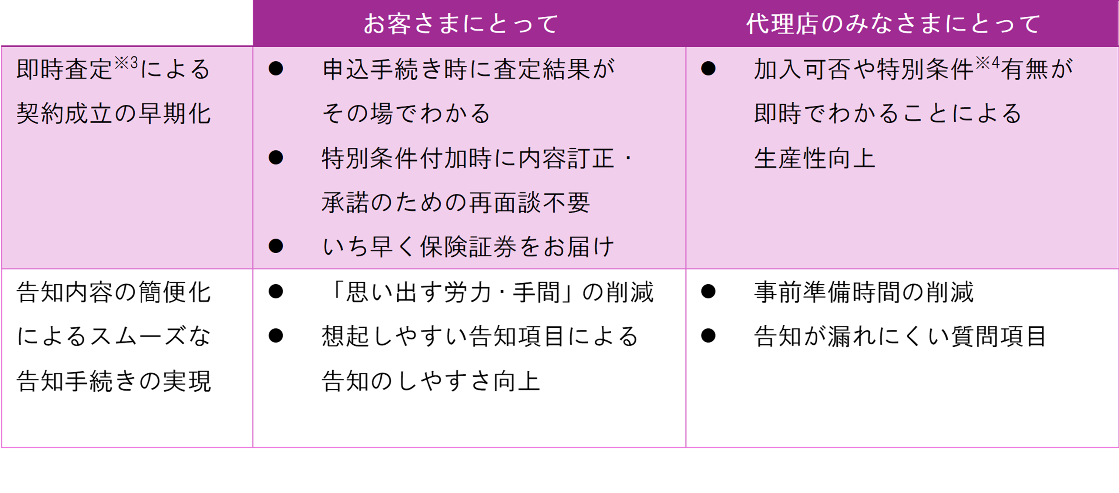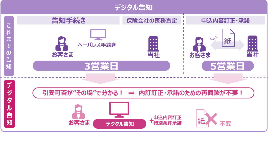 ※3「デジタル告知」の査定結果はお客さまに告知いただいた内容の医学的査定結果となり、当社への過去の申込内容や給付歴等の審査は申込後に別途実施します。