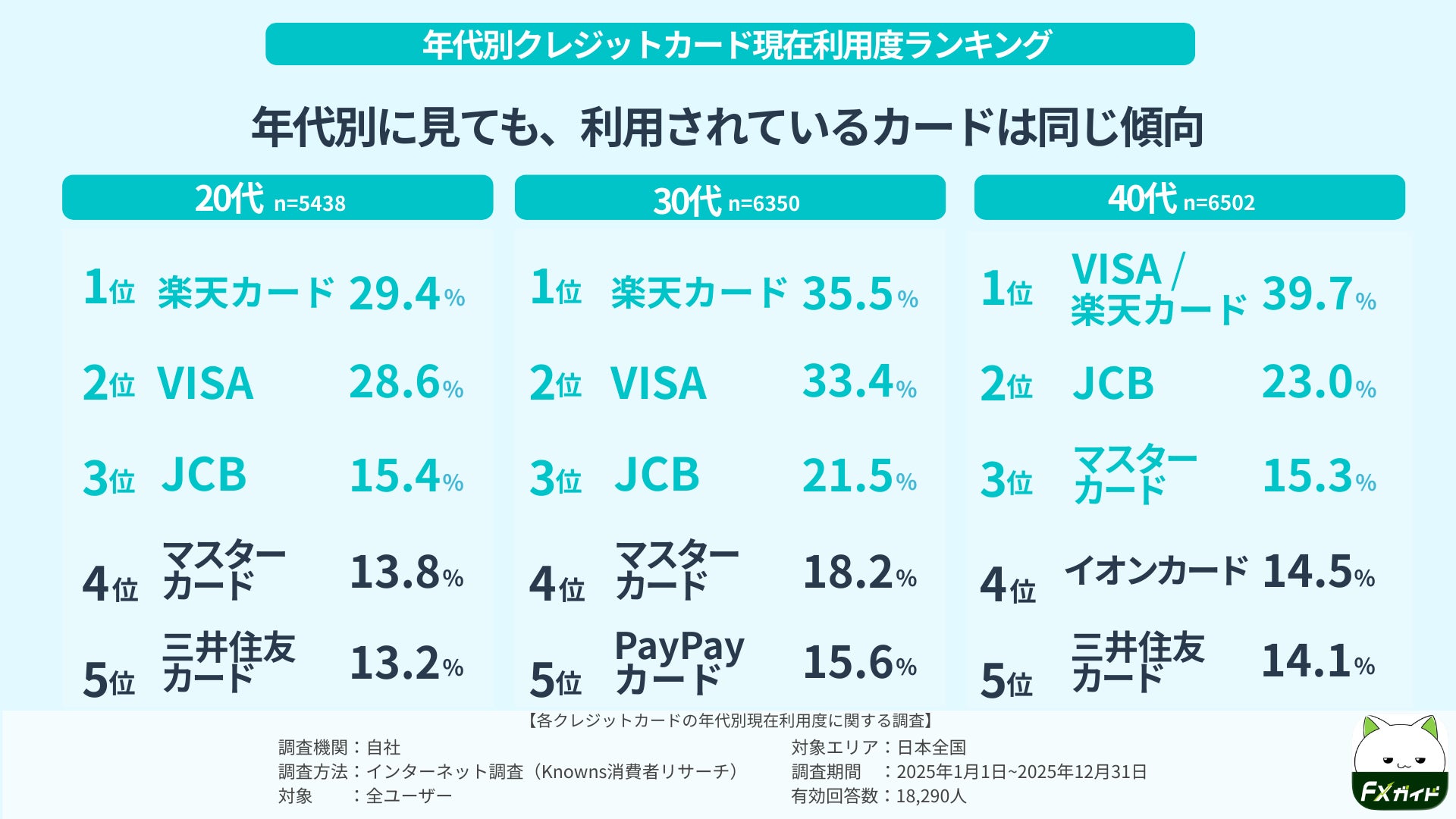 FX初心者ガイドアプリ( https://money.ad-van.co.jp/fx-beginner/ )を運営する株式会社アドバン(本社:東京都品川区、代表:田中勇輝)は、主要クレジットカードブランドを対象に、全体および20代・30代・40代別に「認知度」「現在利用度」「利便性評価」を比較するインターネット調査を実施しました。
