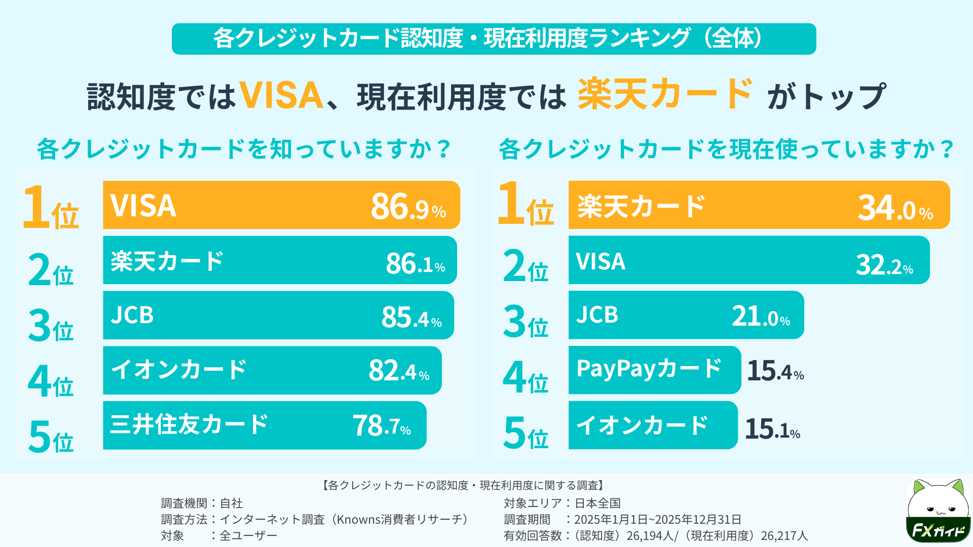 1.【全体認知・現在利用調査】認知度ではVISA、現在利用度では楽天カードがトップ