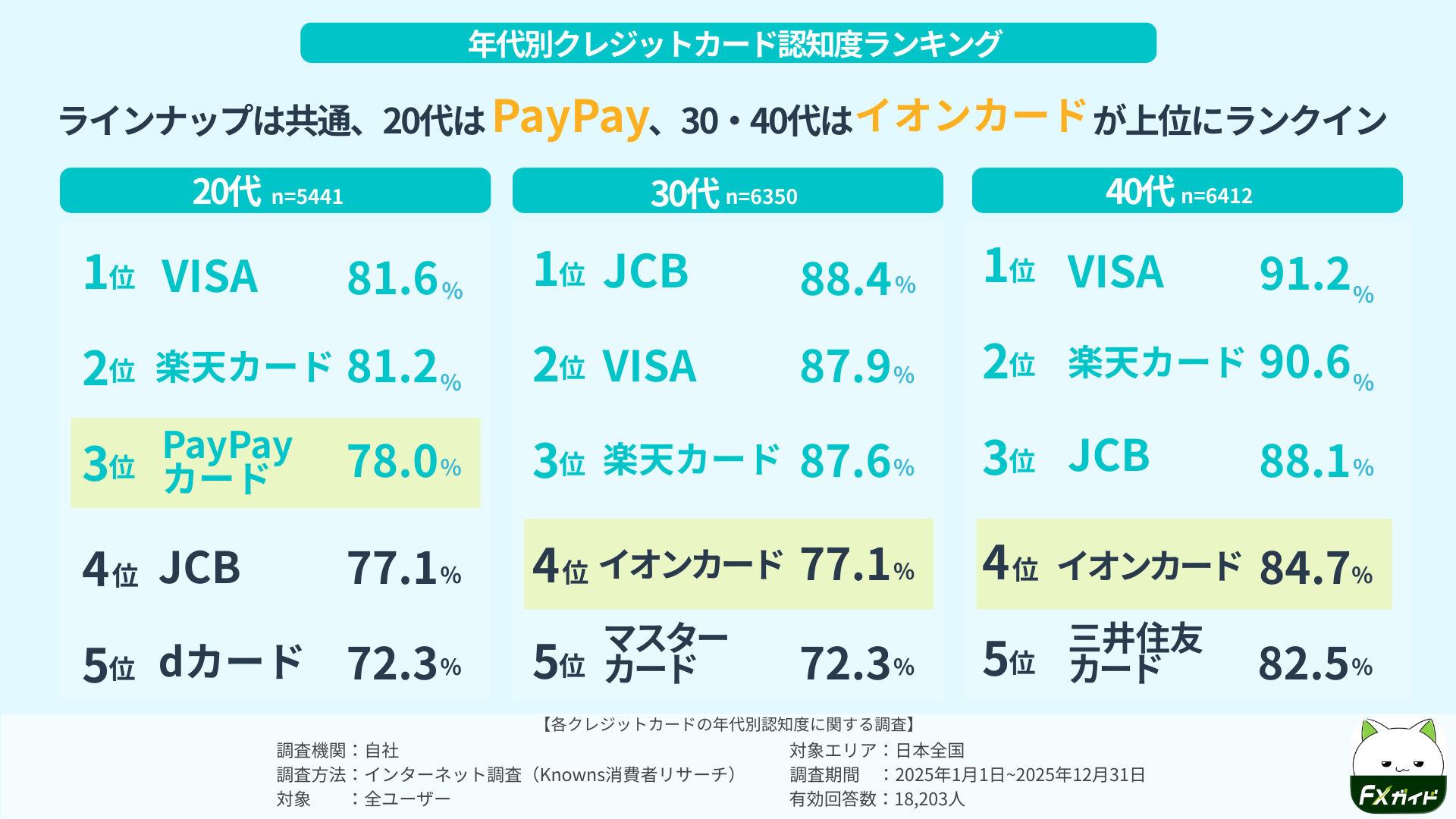 ・年代別認知度において、首位の顔ぶれは大きく変わらないものの、20代ではPayPayカードが、30代・40代ではイオンカードが上位にランクインしました。
