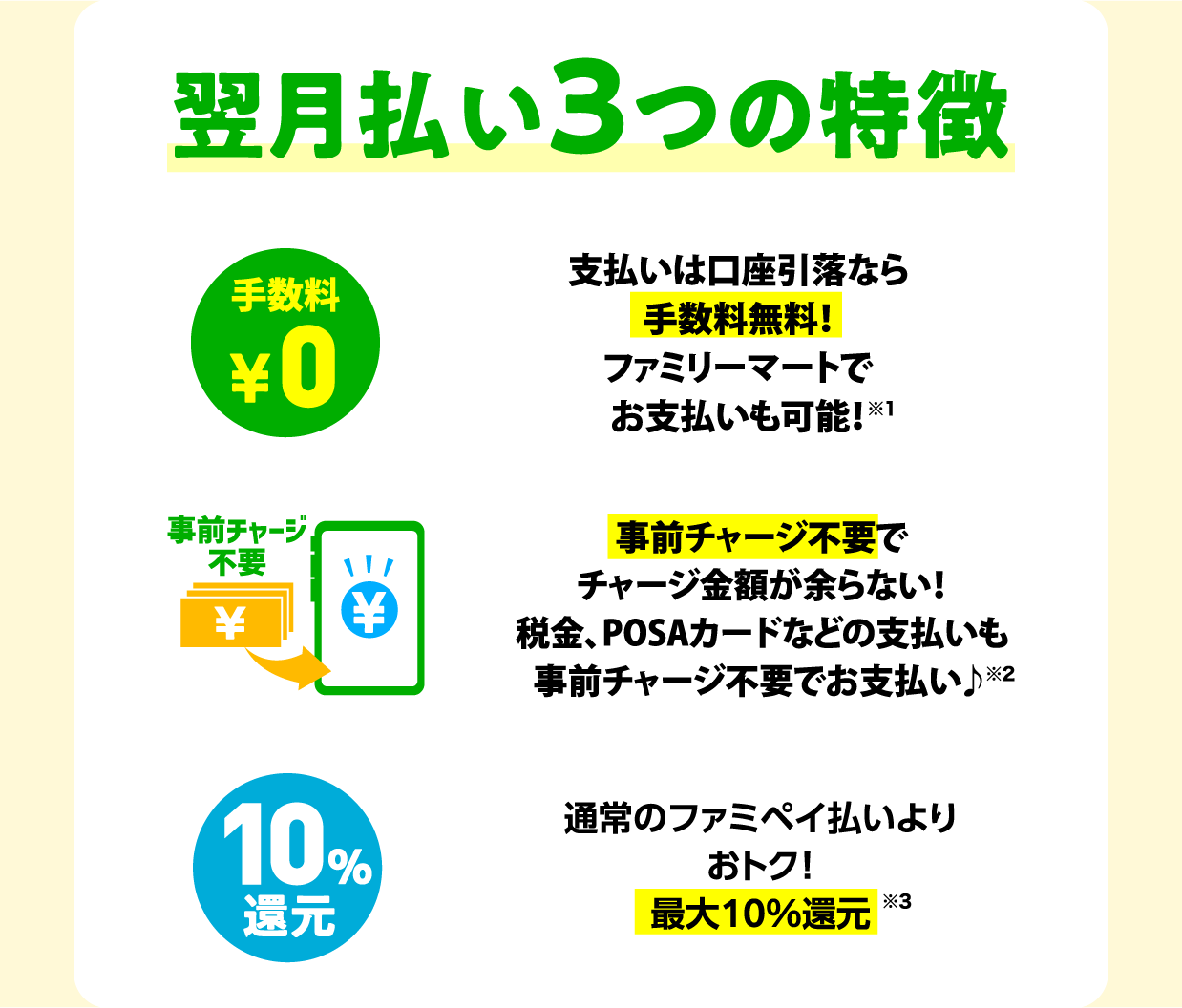 ※1 ファミリーマートでのお支払いには収納事務手数料がかかります。また、口座引落の場合も「自動リボ」および「スキップ払い」、「分割払い」をご利用いただくと手数料がかかります。※2 一部ファミペイ払いがご利用いただけない公共料金・各種料金のお支払いがあります。※3 ファミペイ払いおよびファミペイ翌月払いのご利用による通常の1%還元(公共料金・各種料金等のお支払いの場合は0.5%+10円相当のファミマポイント/件)に加え、ファミペイ翌月払いステップボーナスと合わせ最大10%を還元します。