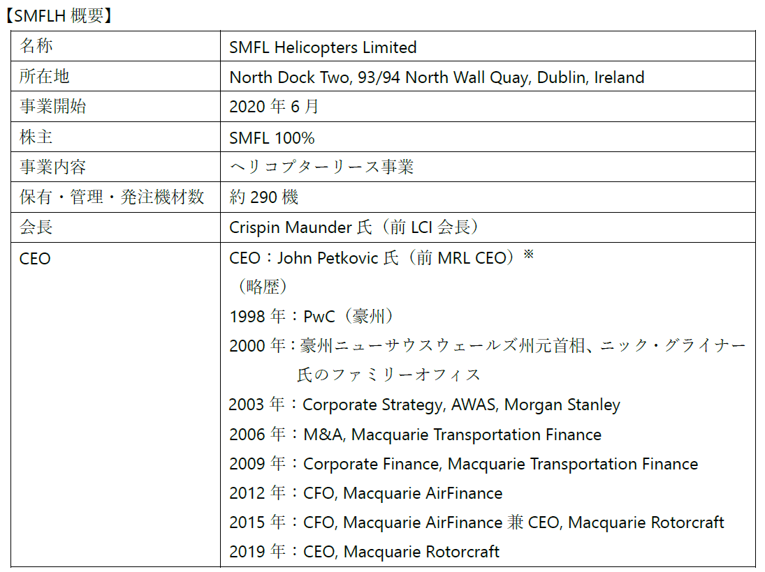 三井住友ファイナンス&リース株式会社(代表取締役社長:今枝 哲郎、以下「SMFL」)は、傘下のヘリコプターリース事業子会社SMFL LCI Helicopters Limited(以下「旧SMFLH」)の商号を、SMFL Helicopters Limited(以下「SMFLH」)へ変更し、2025年5月に取得したMacquarie Rotorcraft Limited(以下「MRL」)と事業を統合して、新たな体制で営業を開始したことをお知らせします。SMFLHのCEOにはJohn Petkovic氏が就任予定※です。