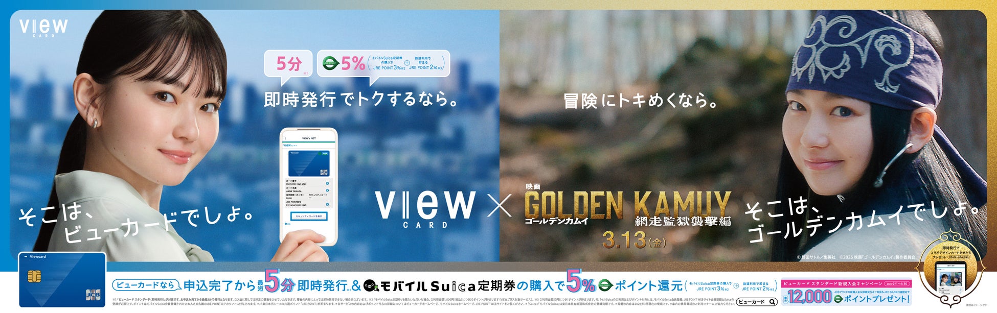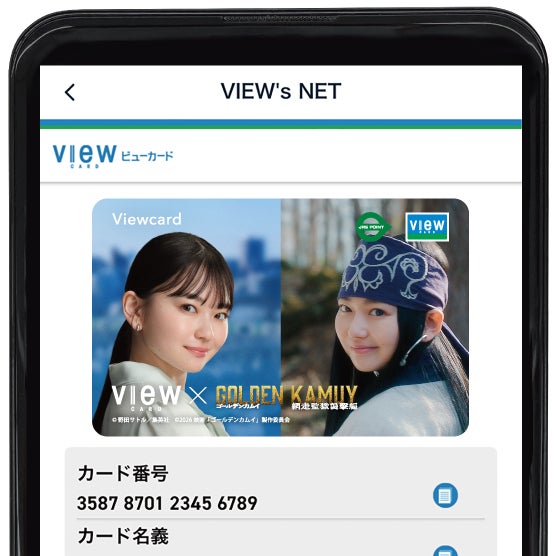 ○ さらに、2026年3月13日(金)から公開となる映画『ゴールデンカムイ 網走監獄襲撃編』の上映に合わせて、主人公の相棒、アイヌの少女「アシㇼパ」役の山田杏奈さんを起用したタイアッププロモーションも展開予定です。これに合わせ、3月中旬より、申込完了から最短5分で即時発行可能なビューカード スタンダードの「即時発行(バーチャルカード)」限定、ビューカードアプリ内で映画『ゴールデンカムイ 網走監獄襲撃編』とのコラボレーションきせかえ券面をプレゼントします!