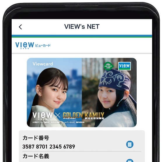 ○ さらに、2026年3月13日(金)から公開となる映画『ゴールデンカムイ 網走監獄襲撃編』の上映に合わせて、主人公の相棒、アイヌの少女「アシㇼパ」役の山田杏奈さんを起用したタイアッププロモーションも展開予定です。これに合わせ、3月中旬より、申込完了から最短5分で即時発行可能なビューカード スタンダードの「即時発行(バーチャルカード)」限定、ビューカードアプリ内で映画『ゴールデンカムイ 網走監獄襲撃編』とのコラボレーションきせかえ券面をプレゼントします!