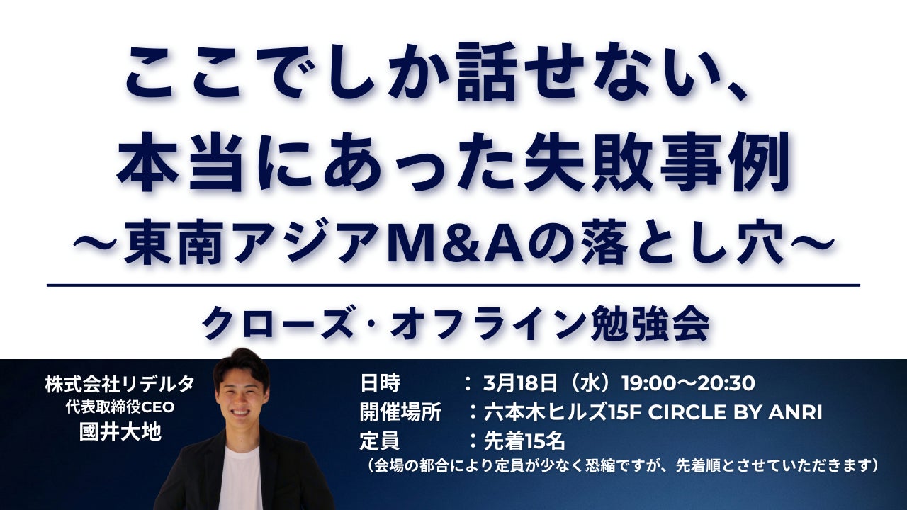 一方で、東南アジアのクロスボーダーM&Aは、国ごとの外資規制・許認可・労務・データ/個人情報・税務・送金/決済など、落とし穴が複合的に現れます。國井さん率いるリデルタのチームが、単なる利便性だけでなく、東南アジアM&Aのインフラとして、案件探索の透明性を上げ、意思決定の質を上げ、そしてM&A後の成功率を上げていくことを引き続き応援しております!