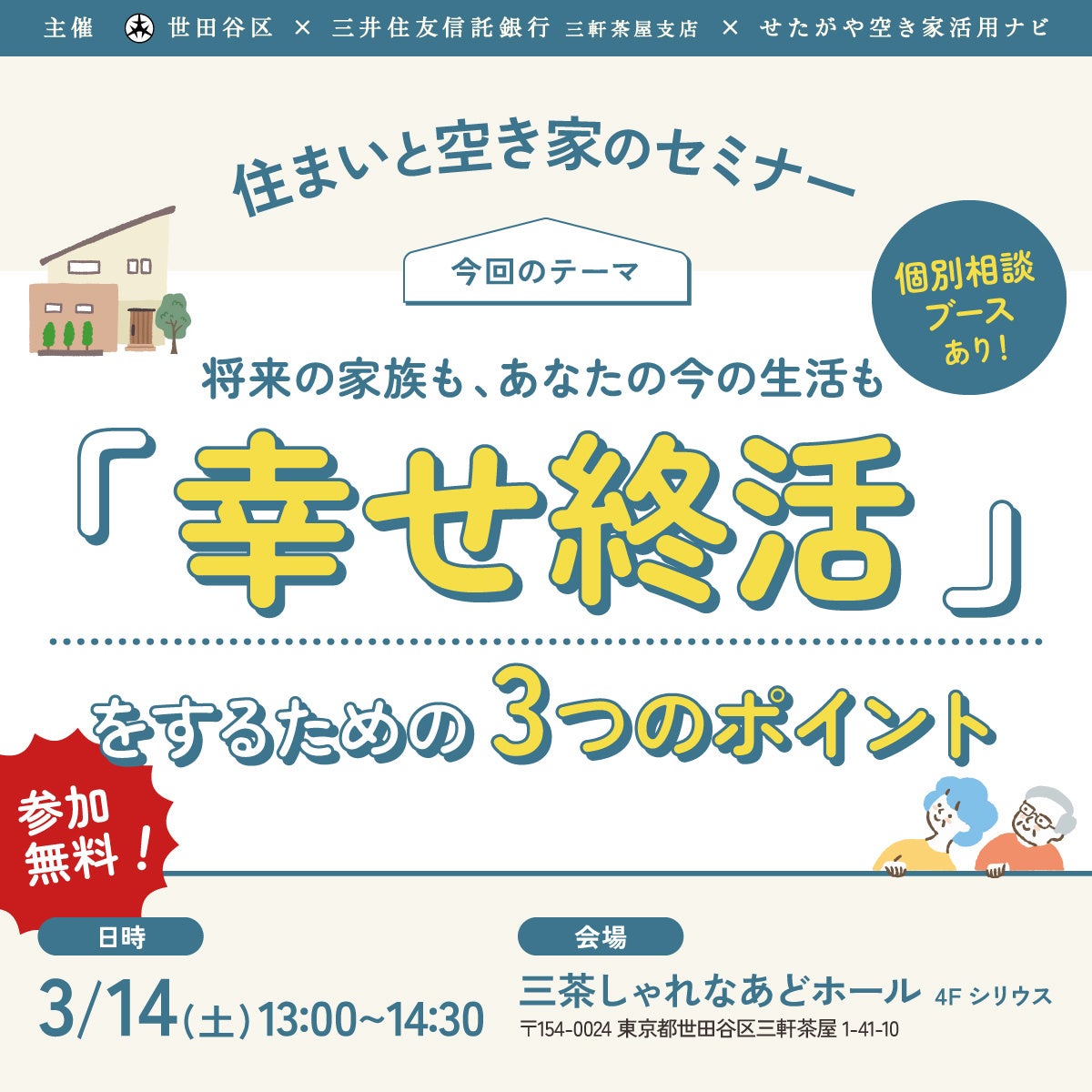 3/14(土)13:00〜14:30 三茶しゃれなあどホールにて開催。事前参加申し込み制、参加無料。個別の相談ができる簡易相談ブースも無料で予約可能。空き家にならないための対処を学んでみてください。