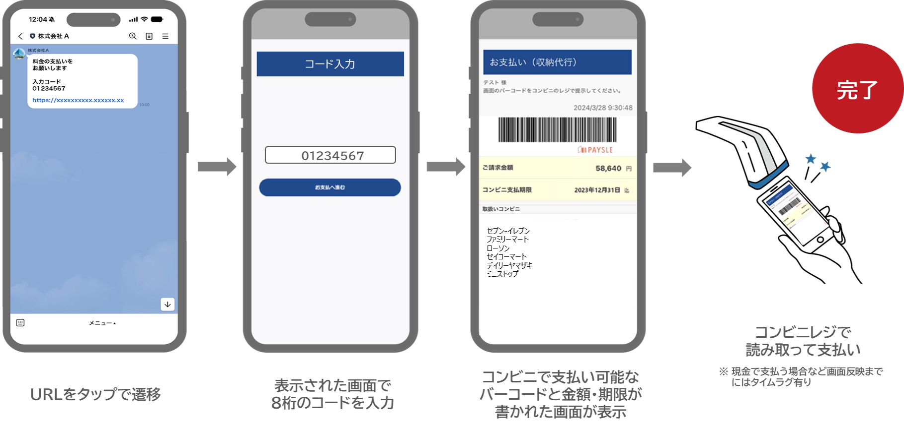 紙の払込票の代わりに、LINE上で電子バーコードを送付し、コンビニ決済をデジタル化いたします。ユーザーはスマホ1つでコンビニ支払いが可能になることに加え、企業の印刷・郵送コストをなくします。