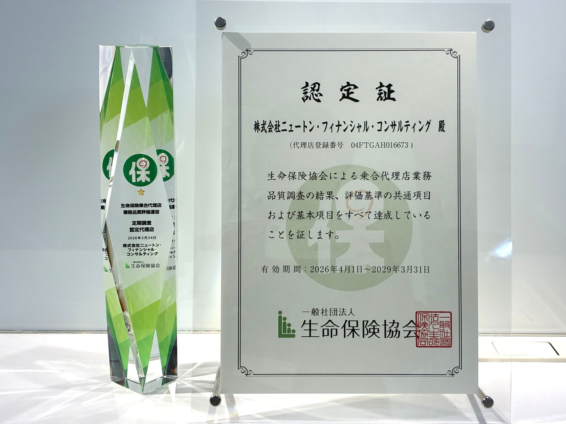 株式会社保険見直し本舗グループ(本社:東京都新宿区/代表取締役社長 グループCEO:臼井朋貴)の子会社である株式会社ニュートン・フィナンシャル・コンサルティング(本社:東京都新宿区/代表取締役社長:三浦雅人)は、2025年度「生命保険乗合代理店業務品質評価運営」にて、すべての基本項目を達成し、引き続き認定代理店となりましたことをお知らせいたします。
