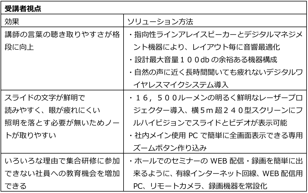 受講者視点で「映像が見やすい」「言葉が聴き取りやすい」最先端の映像・音響機器でシアター並みの視聴環境にレベルアップするとともに、主催者視点で事前レクチャー不要で操作できるスマホ風タッチパネルを導入し、受講者・主催者両サイドの「多様な社員が活躍できる」を追求しました。