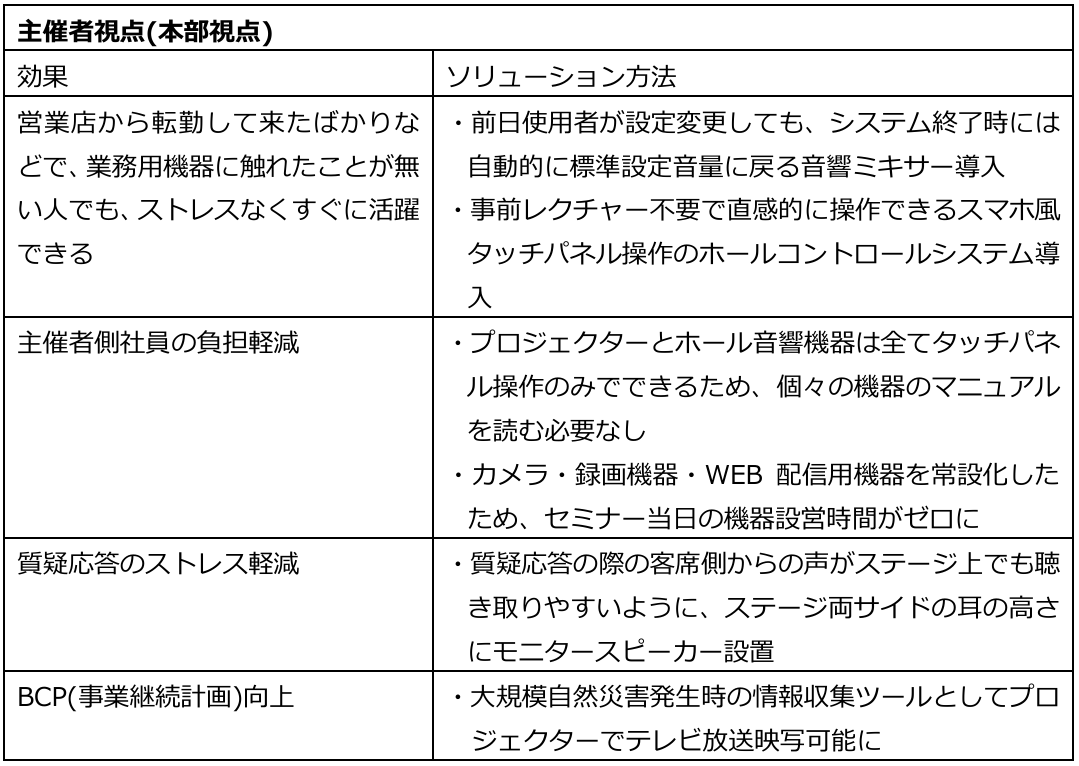 貸会議室も増加しており、またWEBセミナーも一般化しておりますが、自社保有大講堂は多目的ホールとして大きなメリットがあると再認識しリニューアルを実施しました。