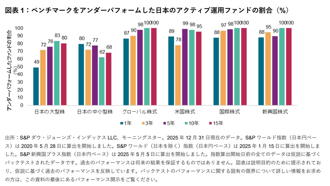 S&P ダウ・ジョーンズ・インデックスの指数投資戦略のアジア太平洋地域のヘッドであるSue Leeは以下のように述べています。「2025年は、日本のアクティブ運用マネージャーにとって厳しい投資環境となり、6つのファンド・カテゴリーのうち5つのカテゴリーにおいて、80%以上のアクティブ運用ファンドが各々のベンチマークをアンダーパフォームしました。もっとも、日本の大型株カテゴリーは例外となり、ベンチマークをアウトパフォームしたファンドがわずかに過半数を超え、2017年以降で最高の相対パフォーマンスとなりました。ただし、長期的には依然として厳しい状況が続いています。2025年12月末までの15年間では、全てのカテゴリーにおいて大多数のアクティブ運用ファンドがベンチマークをアンダーパフォームしました。」