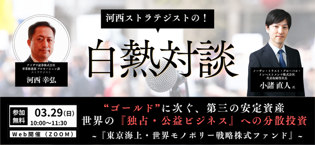 本セミナーには、長年ファンド・マネージャーとして機関投資家向けの運用業務に従事し、現在はノーザン・トラスト・グローバル・インベストメンツ株式会社(所在地:東京都港区)の代表取締役社長を務める小諸直人氏をお招きします。同社は「東京海上・世界モノポリー戦略株式ファンド」の実質的な運用を担当しているマゼラン・アセット・マネジメント・リミテッド(所在地:オーストラリア)の日本における窓口を担当しており、当社事業推進部のストラテジストである河西幸弘による対談形式で当ファンドの魅力と安定資産への分散投資についてお伝えします。