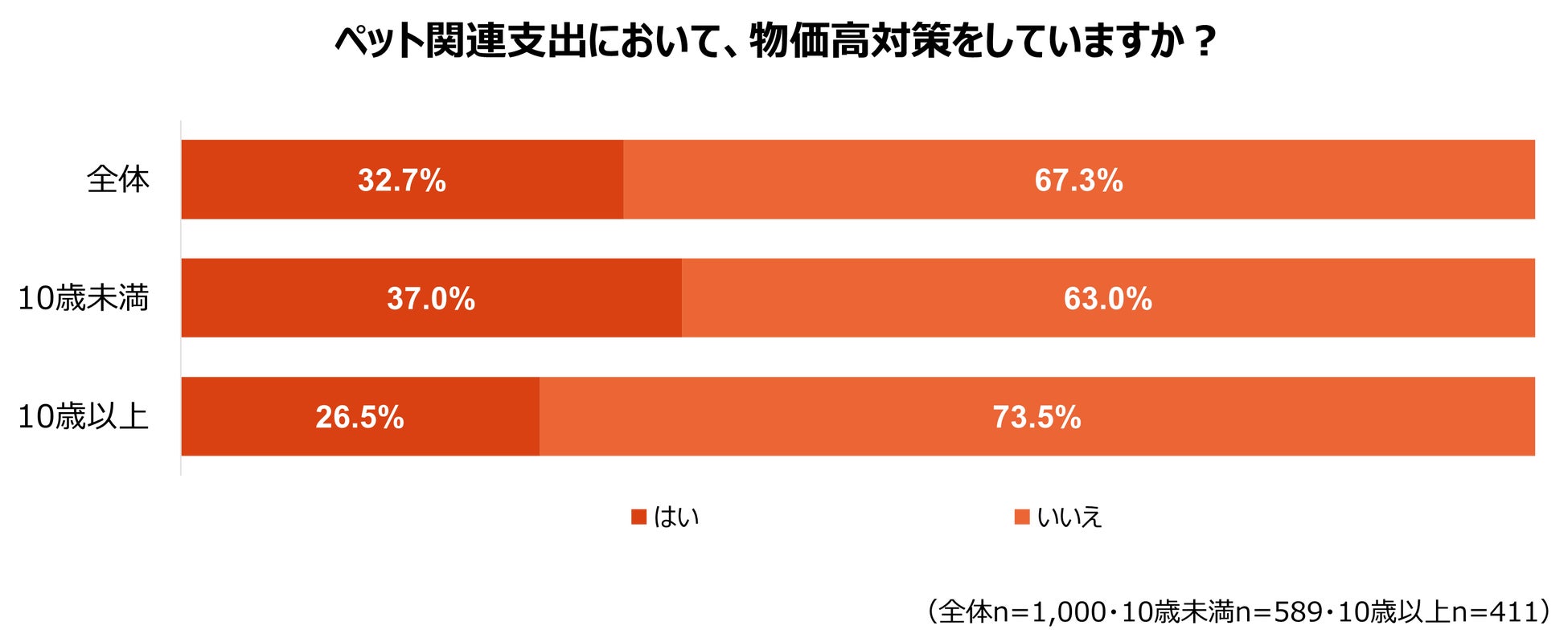 物価高が家計を圧迫する中、ペット関連支出の物価高対策については、対策を「していない」と回答した飼育者は67.3%にのぼりました。特に10歳以上のシニアペットの飼育者では、対策をしていない割合が73.5%と10歳未満より10ポイント以上高い結果となりました。シニアになるほど、お気に入りのフードを購入したり、医療費など健康維持に関する費用が高まったりと、物価高対策をすることが難しいのかもしれません。