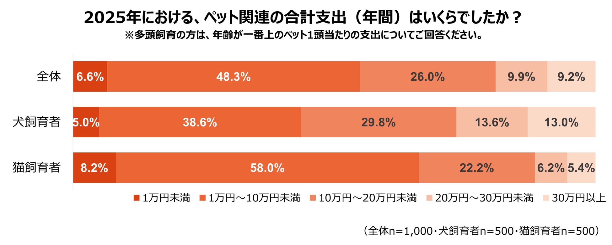 2025年の年間支出を調査したところ、全体では「1万円~10万円未満」が48.3%で最多となりました。犬の飼育者は「10万円以上」の支出が計56.4%にのぼる一方 、猫の飼育者は「1万円~10万円未満」が約6割を占めるなど、犬・猫で支出規模に差が見られました。