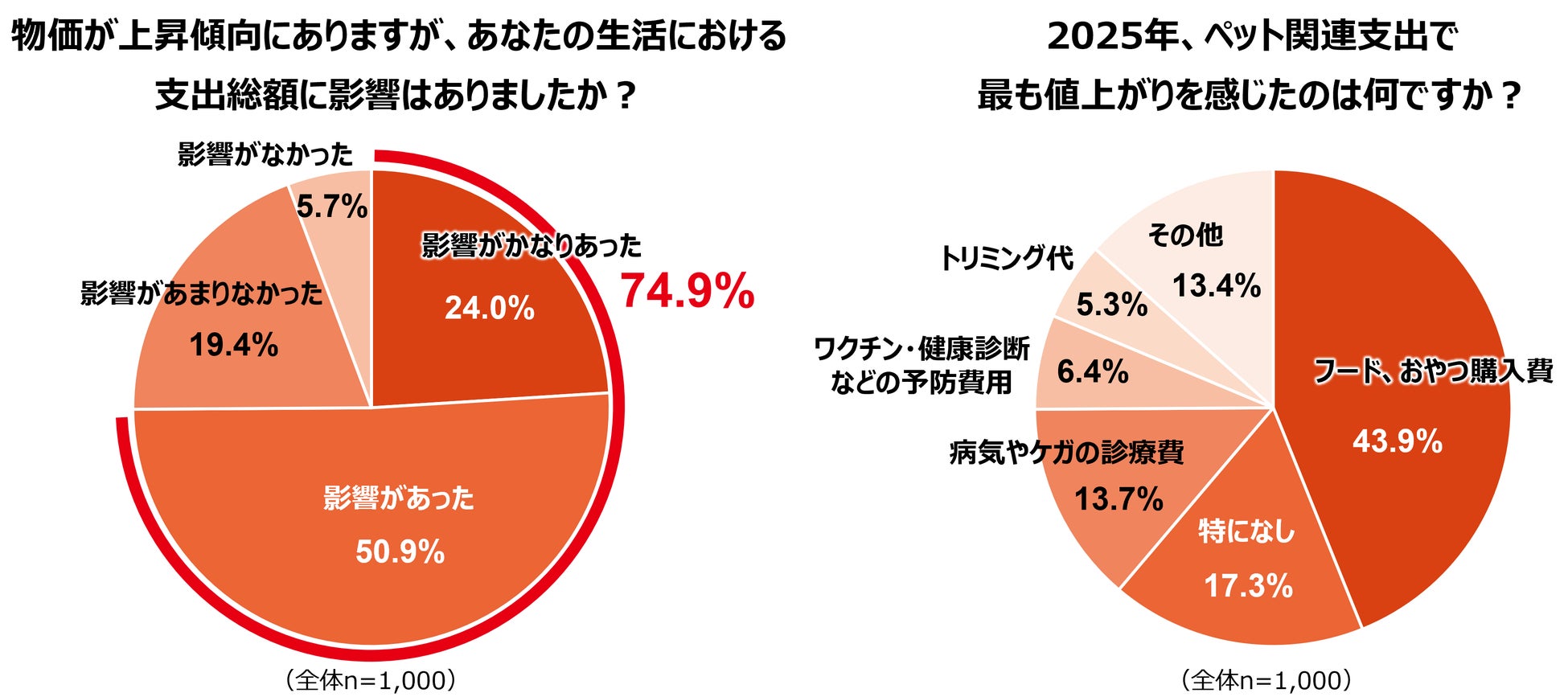 物価上昇が支出総額に与える影響については、全体の74.9%が「影響があった」と回答し、多くのご家庭で家計への負担が増していることが判明しました。ペット関連支出で最も値上がりを感じた項目は「フード・おやつ購入費」が43.9%で突出しています。