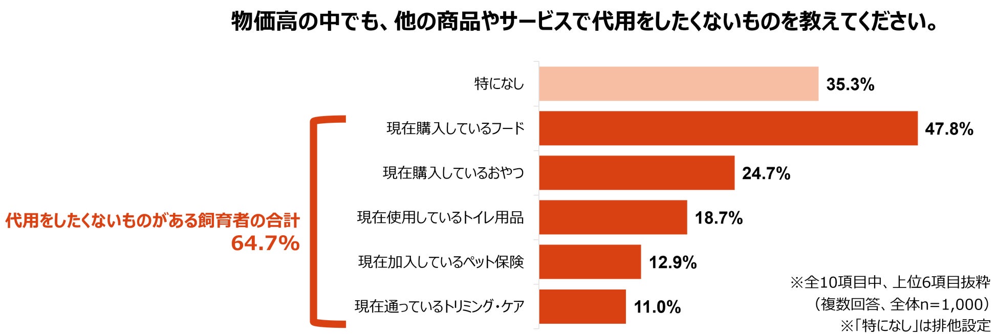 物価高の中でも、他の商品やサービスで代用したくないものがある飼育者は全体の64.7%に達しました。具体的には「現在購入しているフード」が47.8%で最多となり、次いで「おやつ」(24.7%)や「トイレ用品」(18.7%)が続くなど、健康や生活の質に直結する項目が上位を占めています。また、「ペット保険」についても12.9%の飼育者が代用したくないと回答しており、飼育者のこだわりが一定数見られました。