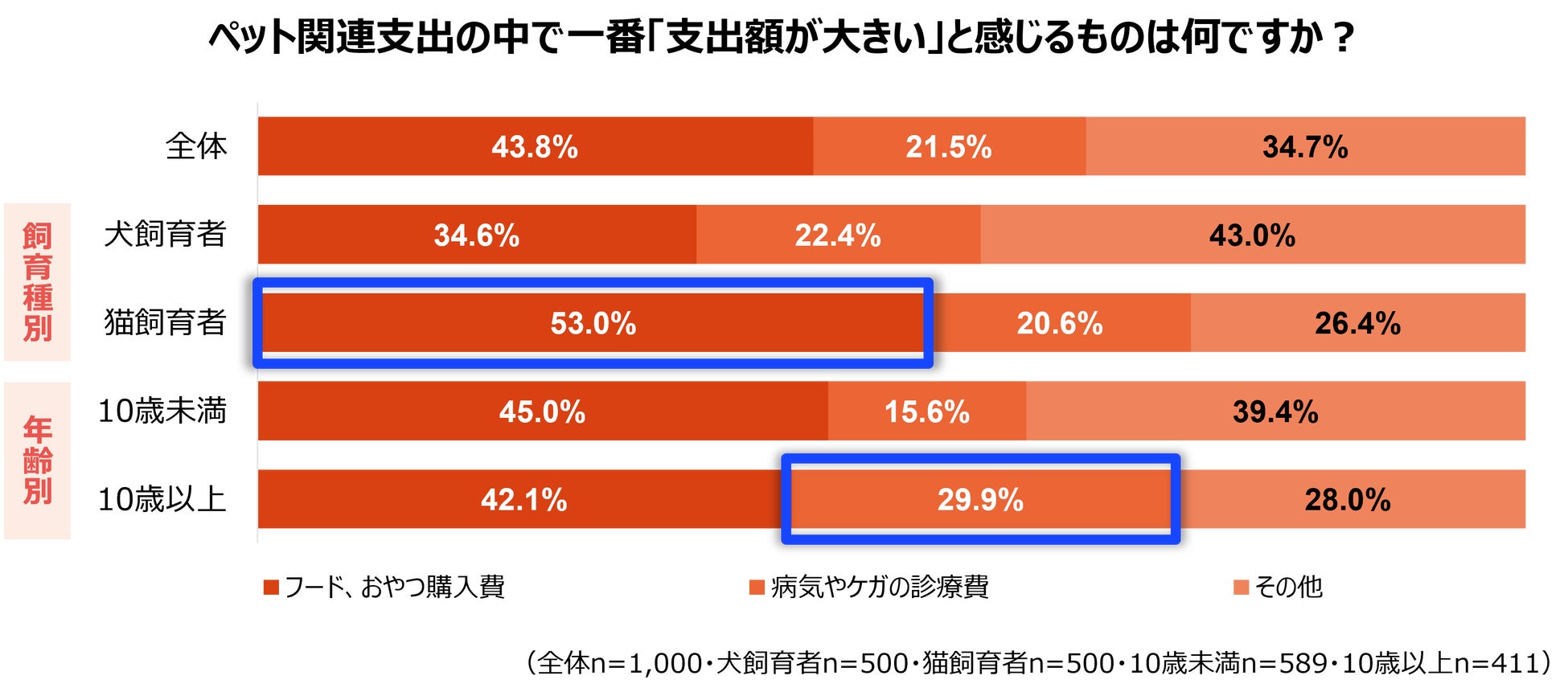 ペット関連支出の中で最も負担が大きいと感じる項目は、「フード・おやつ購入費」が全体で43.8%に達し、特に猫の飼育者では53.0%と半数を超える結果となりました。年齢別で見ると、10歳以上のペットでは「病気やケガの診療費」の割合が10歳未満(15.6%)の約2倍となる29.9%に増加しており、年齢に伴い医療費の比重が高まる傾向が顕著です。