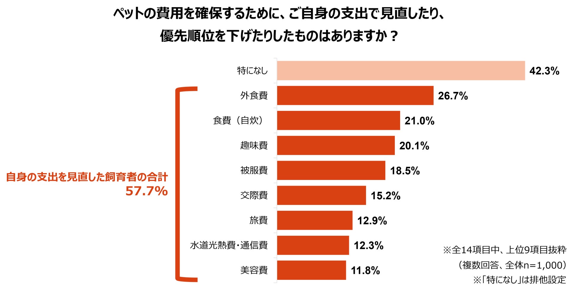 ペットの費用を確保するためのご自身の支出の見直しについて調査したところ、57.7%の飼育者が何らかの見直しや優先順位の引き下げを行っていることが分かりました。内訳をみると、特に「外食費」(26.7%)や「食費(自炊)」(21.0%)が上位に挙がっています。