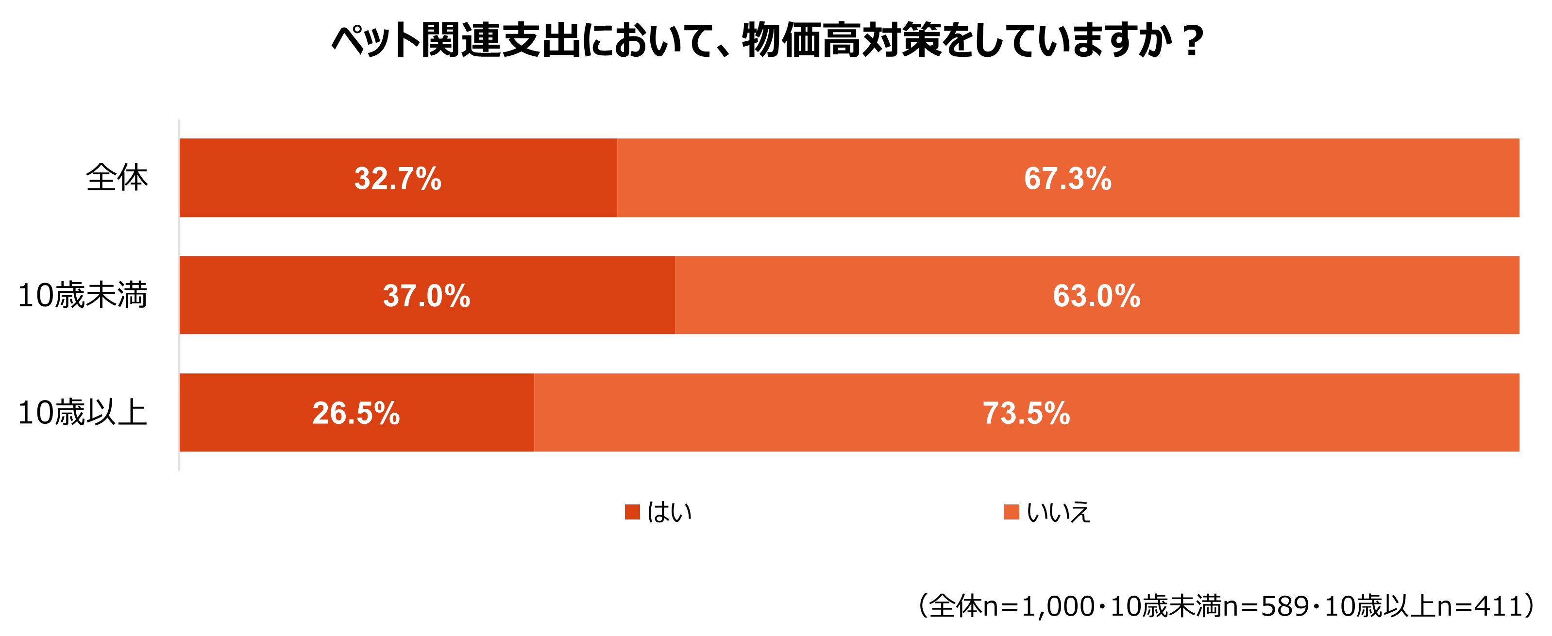 物価高が家計を圧迫する中、ペット関連支出の物価高対策については、対策を「していない」と回答した飼育者は67.3%にのぼりました。特に10歳以上のシニアペットの飼育者では、対策をしていない割合が73.5%と10歳未満より10ポイント以上高い結果となりました。シニアになるほど、お気に入りのフードを購入したり、医療費など健康維持に関する費用が高まったりと、物価高対策をすることが難しいのかもしれません。
