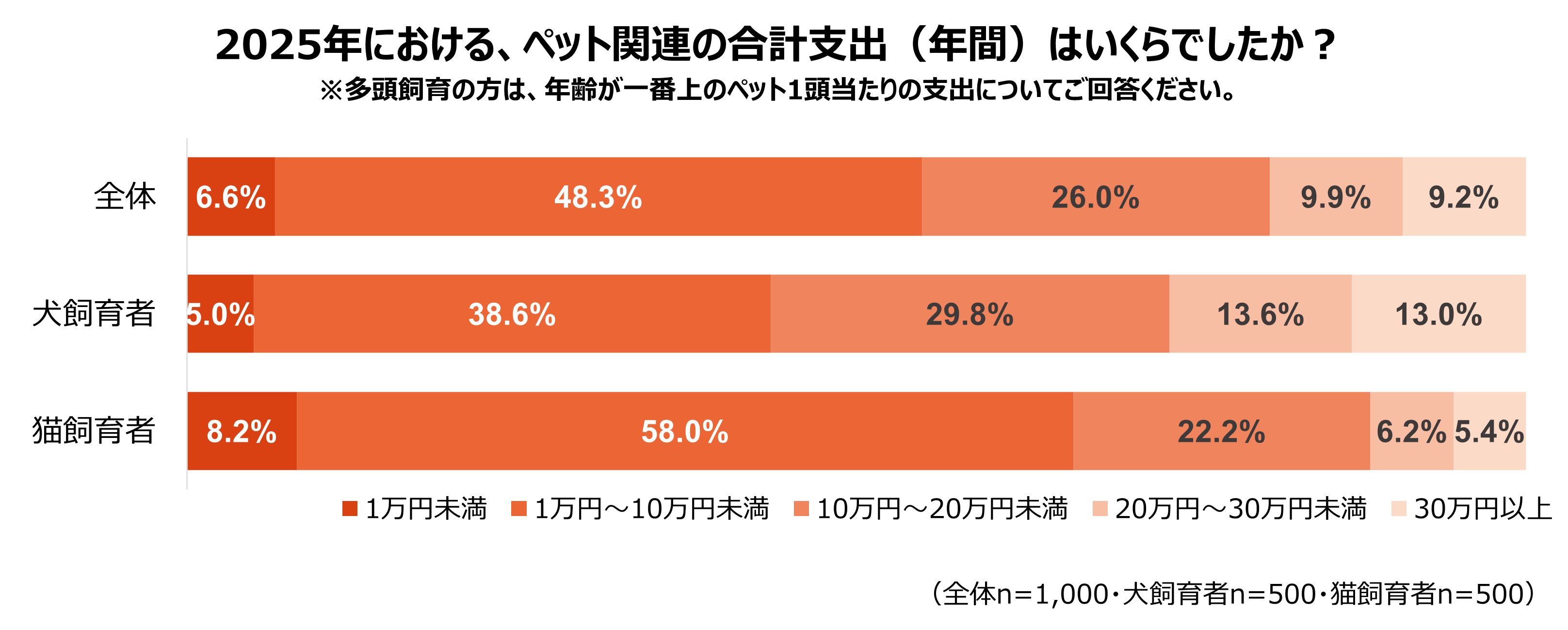 2025年の年間支出を調査したところ、全体では「1万円~10万円未満」が48.3%で最多となりました。犬の飼育者は「10万円以上」の支出が計56.4%にのぼる一方 、猫の飼育者は「1万円~10万円未満」が約6割を占めるなど、犬・猫で支出規模に差が見られました。