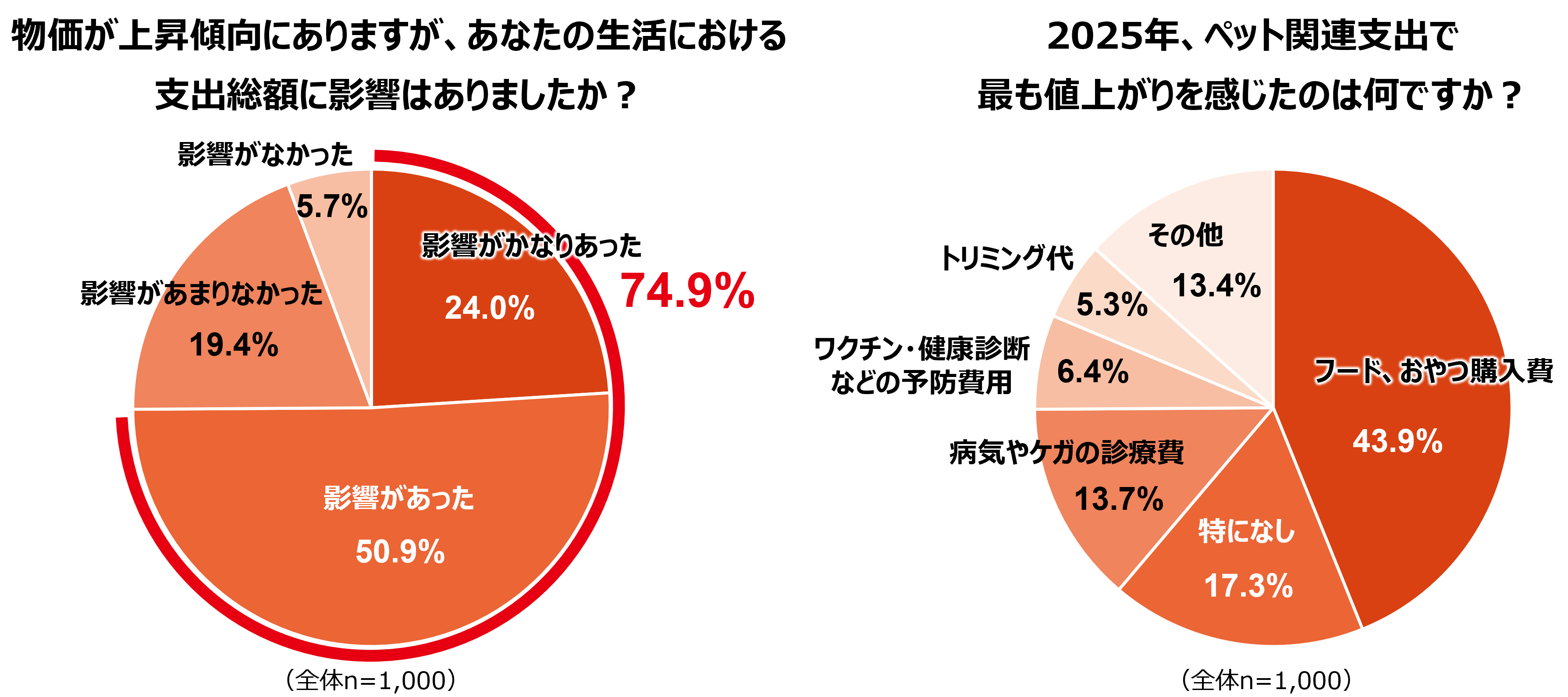 物価上昇が支出総額に与える影響については、全体の74.9%が「影響があった」と回答し、多くのご家庭で家計への負担が増していることが判明しました。ペット関連支出で最も値上がりを感じた項目は「フード・おやつ購入費」が43.9%で突出しています。