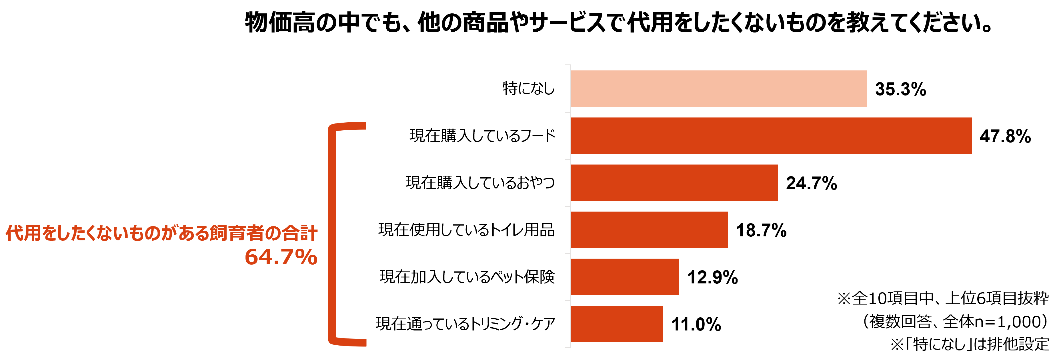 物価高の中でも、他の商品やサービスで代用したくないものがある飼育者は全体の64.7%に達しました。具体的には「現在購入しているフード」が47.8%で最多となり、次いで「おやつ」(24.7%)や「トイレ用品」(18.7%)が続くなど、健康や生活の質に直結する項目が上位を占めています。また、「ペット保険」についても12.9%の飼育者が代用したくないと回答しており、飼育者のこだわりが一定数見られました。