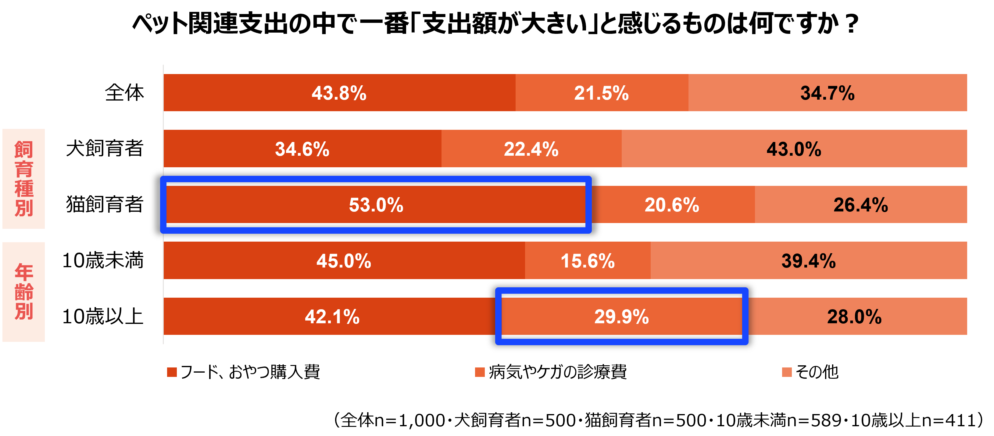 ◆ペット関連支出の中で一番支出額が大きいものは、「フード・おやつ代」が約4割、次いで「病気・ケガの診療費」。猫は「フード・おやつ代」が5割超。10歳以上のペットは「病気・ケガの診療費」の回答が約2倍に