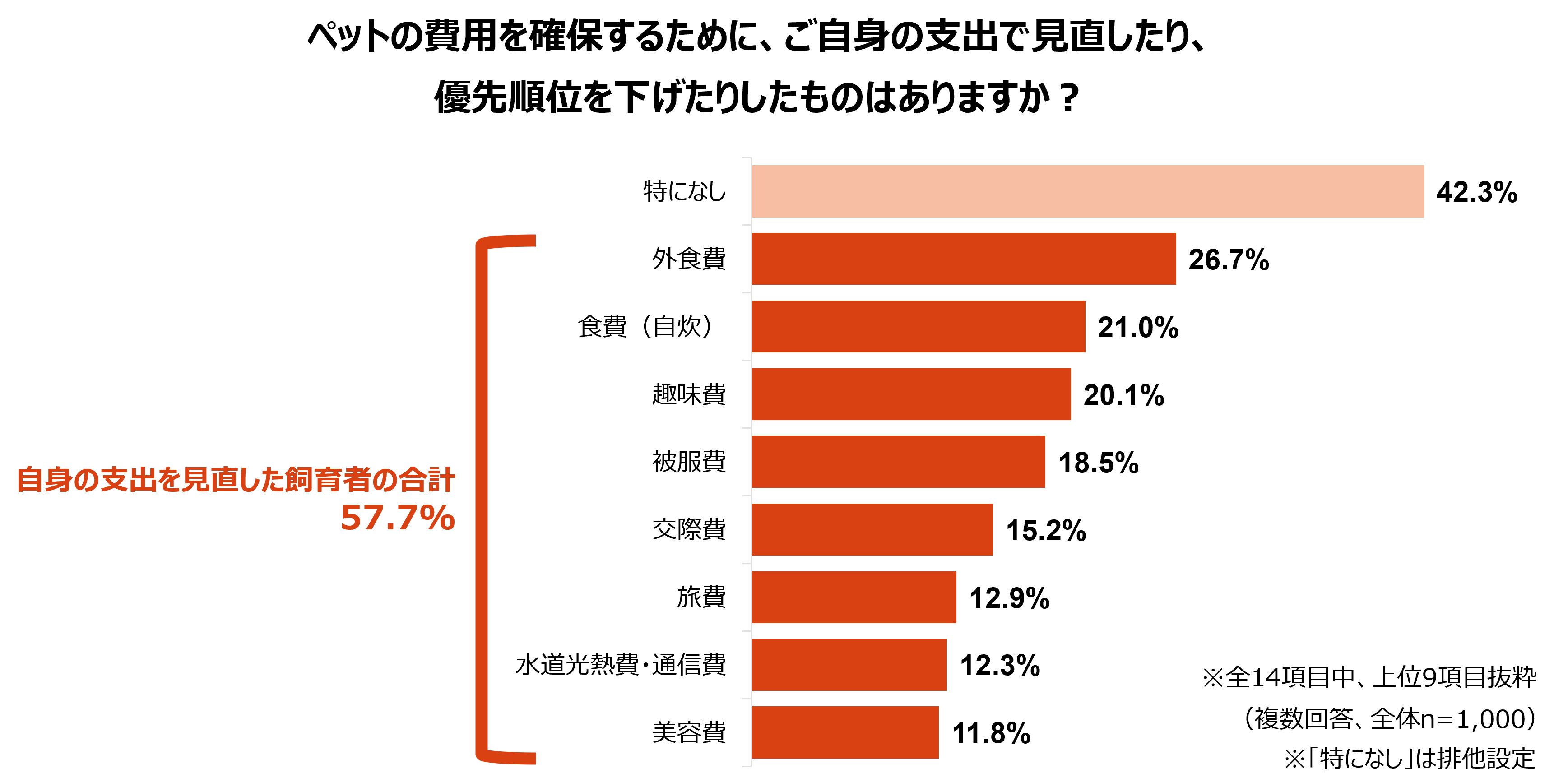 ペットの費用を確保するためのご自身の支出の見直しについて調査したところ、57.7%の飼育者が何らかの見直しや優先順位の引き下げを行っていることが分かりました。内訳をみると、特に「外食費」(26.7%)や「食費(自炊)」(21.0%)が上位に挙がっています。
