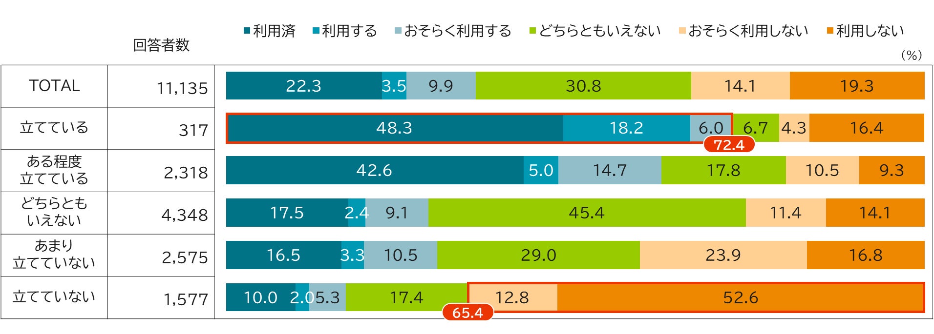 同調査では、NISAの利用率に加え、NISAを利用していないと回答した人に対し「NISA制度を今後利用しますか」と聴取しました【図表3】。すると、利用済+利用意向がある人の合計では35.8%でした。利用率は22.3%であるため、利用意向がある人が全員NISAを利用した場合、NISAの利用者が最大で現状の1.6倍にまでなる可能性がある、といえます。