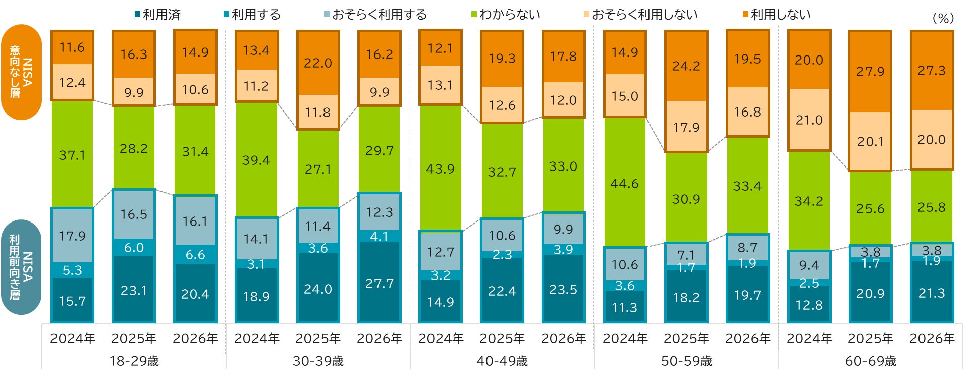 このデータを年代別に分析すると、おおむねどの年代でもNISA前向き層の増加が見て取れます【図表5】。一方で、18-29歳は利用前向き層が若干減少、60代は利用意向なし層が高止まりしている状況です。