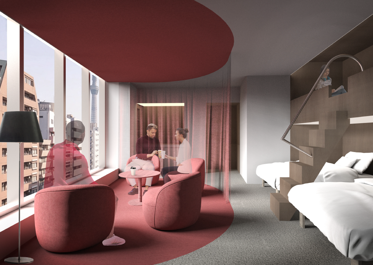 2〜11 階の各フロアに2部屋(各40㎡超、定員4名)を配置し、浅草通り側の部屋はスカイツリービューとなっており、コンセプトは「街に浮かんだラウンジ」。そしてもう1部屋は「奥の隠れ家」をコンセプトにしています。