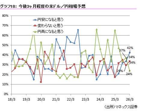 【円安になると思う】(2025年12月)34% →(2026年3月)42%(前回比 +8%)