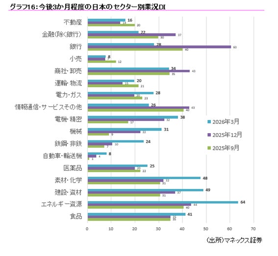 今後3か月程度の日本のセクター別業況DIは「エネルギー資源」が最高で64、「小売」、「自動車・輸送機」が最低で8となりました。直近で株高を牽引していた「情報通信・サービスその他」についてはDIが26と、過去3回の調査結果で最も低い結果となりました。これまで上昇を主導してきたセクターの勢いに一服感が見られ、セクターローテーションの動きがあるのかもしれません。