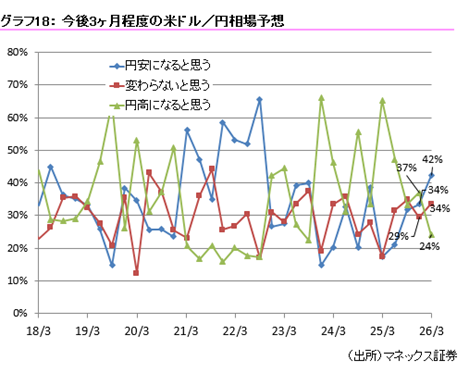 【円安になると思う】(2025年12月)34% →(2026年3月)42%(前回比 +8%)