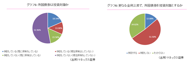 さらに、金利が上昇した場合に外国債券を投資対象とするかについてたずねたところ、「検討しない」との回答が51.50%と半数を超えました。