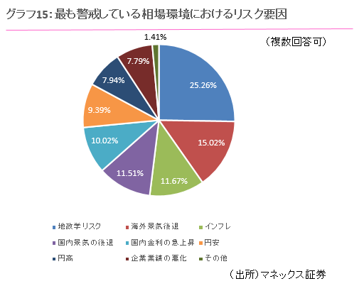 ・相場環境におけるリスク要因としては「地政学リスク」が最も高い。
